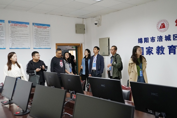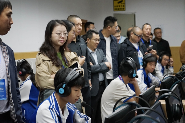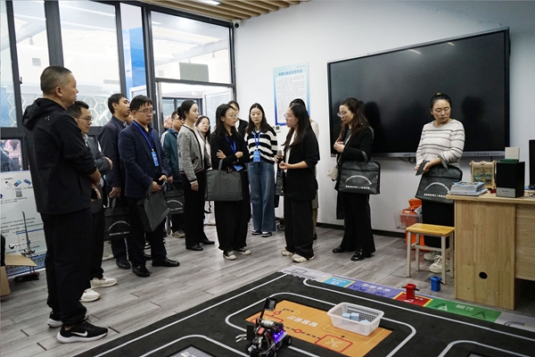 在信息科创中心与教导处老师的引导下,参训教师实地走访了我校智慧校园安防系统、教育技术功能场地、中高考标准化考点设备、人工智能活动中心、科创功能室等十余个专业场馆,亲身体验我校在教育信息化、人工智能、科创教育、跨学科课程等方面的硬件设施与教学实践。