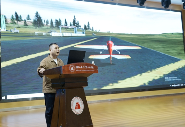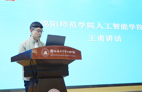 在学术报告厅,绵阳师范学院人工智能学院王甫院长发表讲话。随后,两校共同完成“人工智能教育基地”授牌仪式,标志着高校与基础教育学校在资源共享、课程共建、师资共育方面迈出坚实一步。
