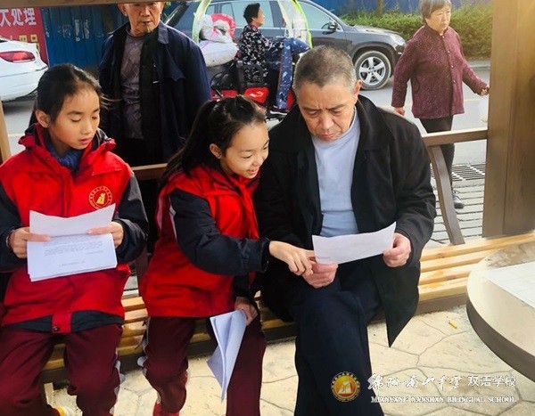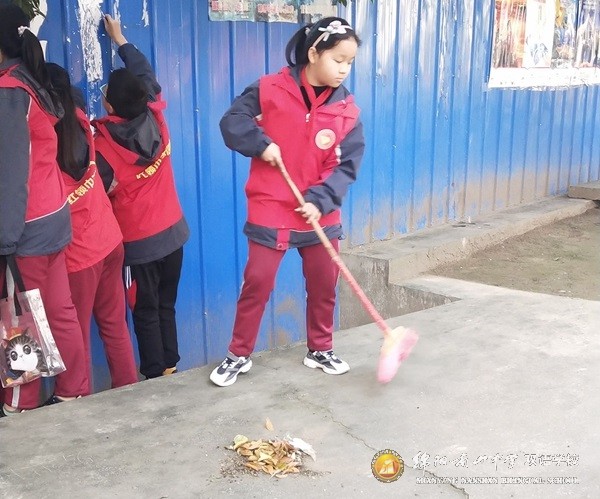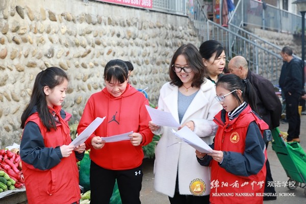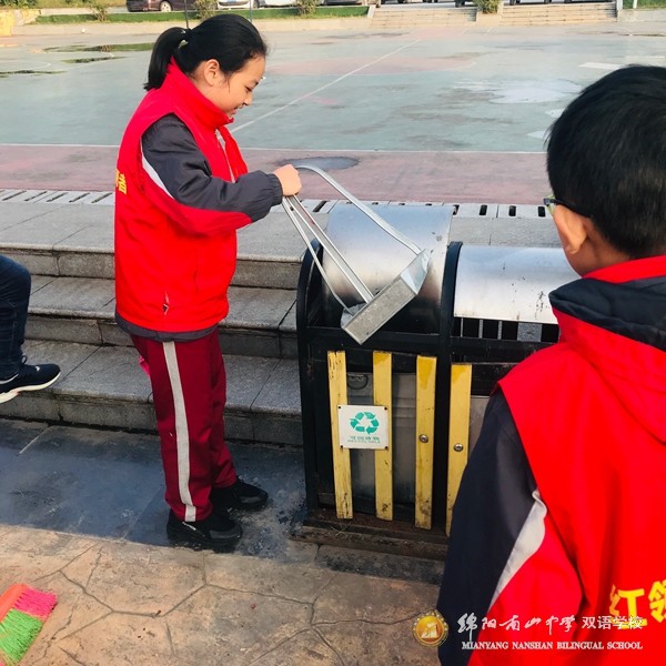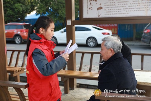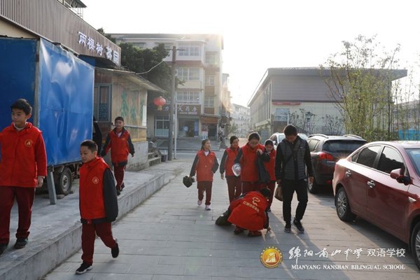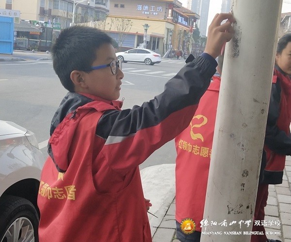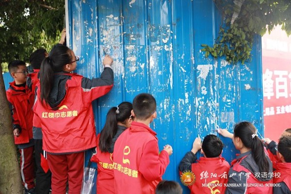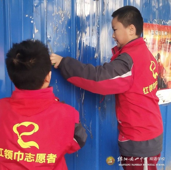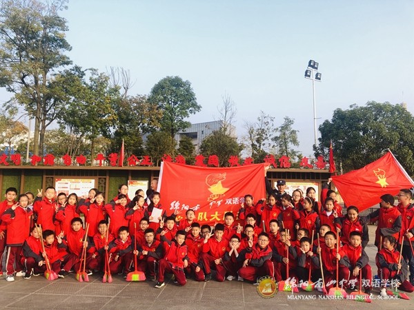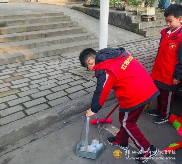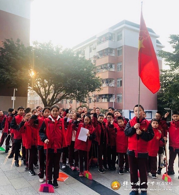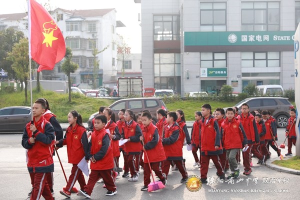 为积极参与创建全国文明卫生城市,着力营造文明、卫生、和谐的环境。11月7日,南山中学双语学校少先队大队部号召5.4中队的少先队员们开展了“我是文明绵阳人 ”学雷锋志愿者服务活动。队员们在辅导员老师和政教员老师的带领下,带着创建文明城市宣传资料和各种劳动工具,走进了上马新村社区,向过往群众宣传,号召市民们共同爱护身边的环境。