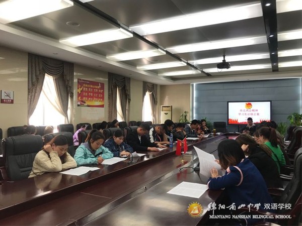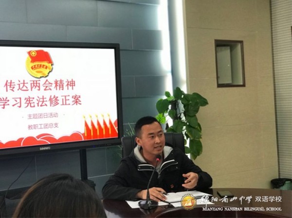 3月22日下午,教职工团总支于行政楼会议厅召开三月主题团日活动,活动主要内容为学习《 中华人民共和国宪法修正案 》、《 十九届中央委员会第三次全体会议公报 》、《 2018年四川学校共青团工作要点》,教工团总支书记岳智刚同志主持会议,小学团支部、初中团支部、高中团支部、后勤职工团员,全体团员共56人参加本次会议。学校党委副书记李华平同志到场指导工作。