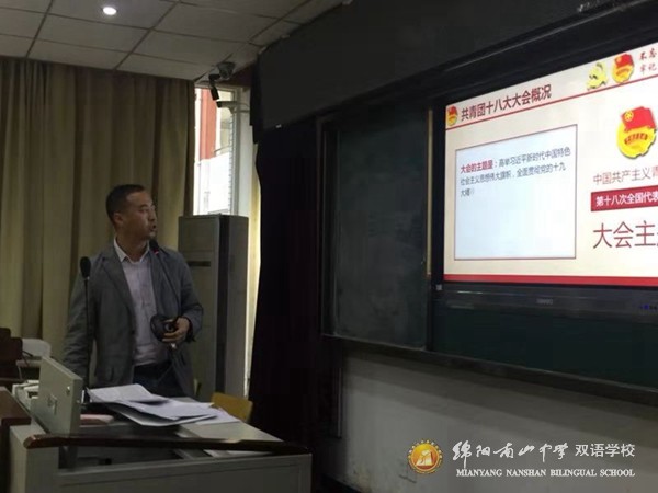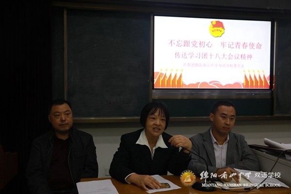 2018年10月11日下午5点,我校教职工团总支在道德讲堂召开了以“不忘跟党初心 牢记青春使命”传达学习团的十八大会议精神会议。绵阳南山中学双语学校党委副书记李华平,学校党委委员、党办主任王明光,教职工团总支书记岳智刚参加了会议。