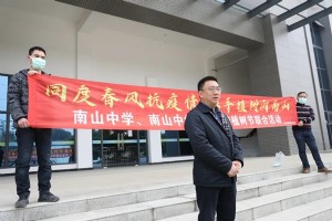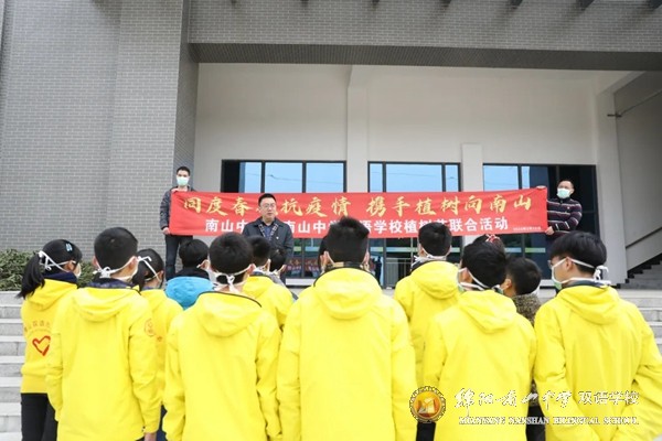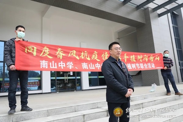 2020年3月12日上午10:30,在南山中学体育馆外,南山中学、南山中学双语学校联合开展以“同度春风抗疫情,携手植树向南山”为主题的植树节活动。
